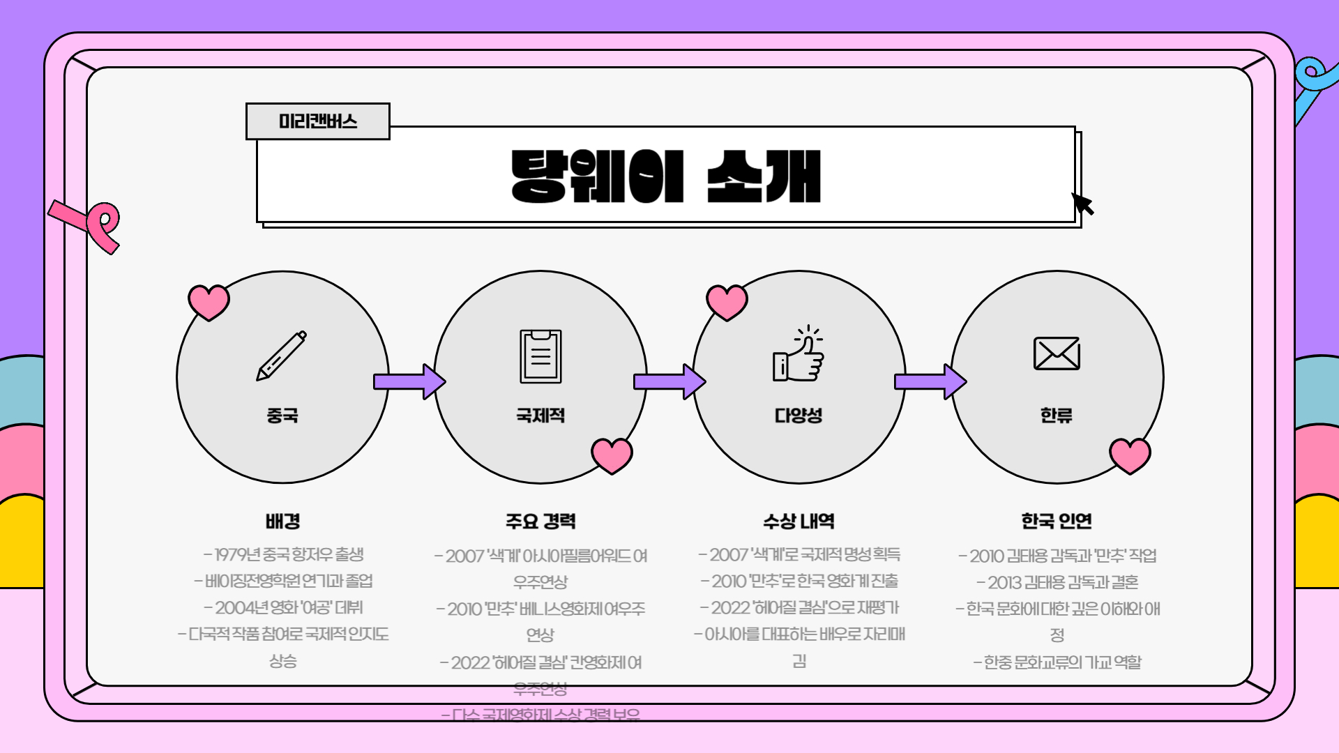 탕웨이는 2007년 리안 감독의 영화 <색, 계>로 세계적인 주목을 받으며 데뷔 이후 줄곧 아시아를 대표하는 배우로 활동해 왔습니다. 그녀는 <만추>를 통해 김태용 감독과 인연을 맺었고, 2014년 결혼, 2016년에는 딸 썸머 양을 출산하며 가족을 꾸렸습니다.